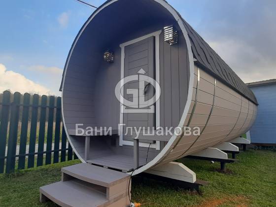 Давно не строили круглые бани — и вот отличная причина вспомнить классику! Эта баня-бочка диаметром 2,4 м и длиной 5,9 м собрана из термодревесины, что делает её особенно долговечной и устойчивой к влаге.