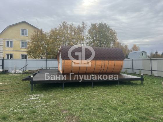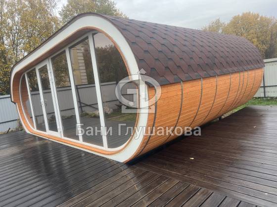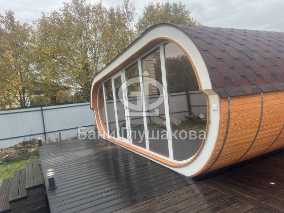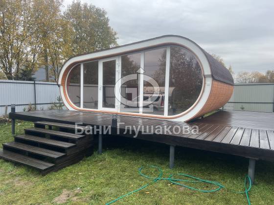 На этот раз мы построили баню «Танк Панорама» — современный вариант с панорамным остеклением и просторной террасой-подиумом.