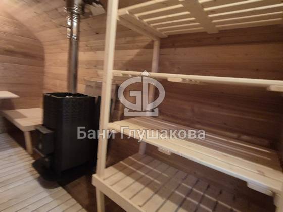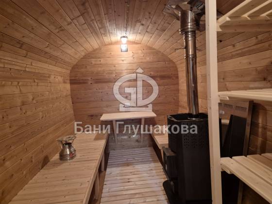 Конструкция выполнена из прочных и долговечных материалов, обеспечивающих тепло и защиту от влаги. За счёт округлой формы, характерной для бани-бочки, помещение выглядит аккуратно и современно, а внутри сохраняется уют и комфорт.