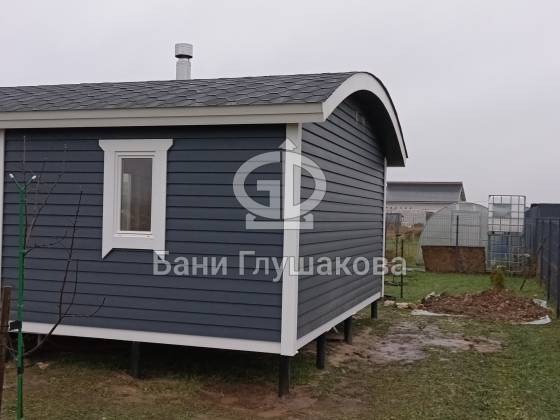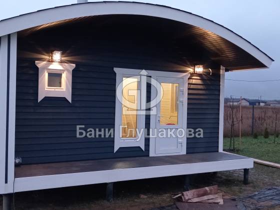 Глубокий тёмно-синий оттенок подчёркивает форму, делает баню визуально дорогой и благородной, а белая окантовка добавляет аккуратности и чистоты линий. Вечером, когда включается мягкий свет, баня будто растворяется в сумерках и выглядит особенно уютно — точно маленький домик, где всегда тепло и спокойно.