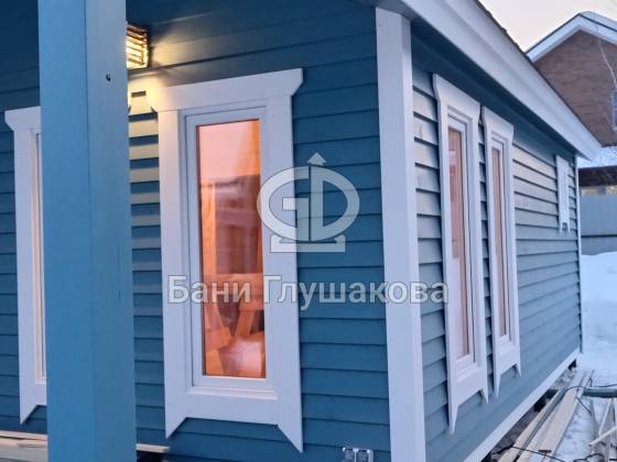 Синий цвет фасада — смелое и удачное решение. Он отлично контрастирует с зимним пейзажем и выделяет баню на фоне стандартных деревянных построек. Сейчас мы завершаем последние штрихи и готовим объект к сдаче владельцам.