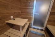 Баня сделана из отсортированной термодоски — мы отобрали хорошее дерево, но с небольшими косметическими изъянами. Ничего критичного, просто живой материал с характером.