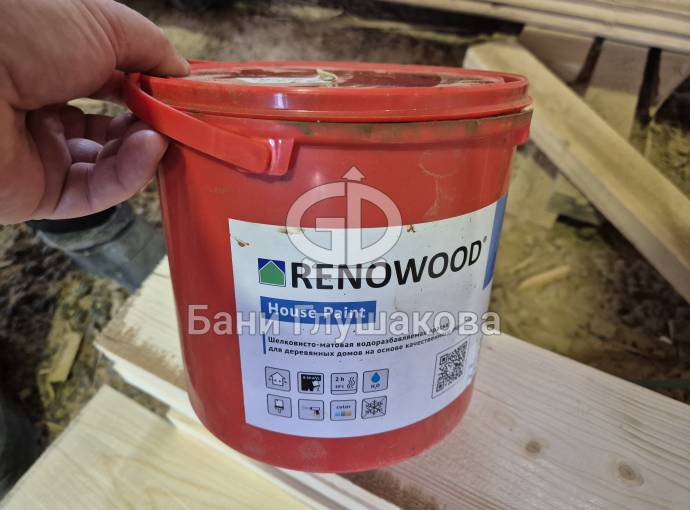 Снаружи баня покрыта новой для нас краской финского производства Renowood House Paint в стильном оттенке 8007 — тёплый, уютный, живой цвет, который подчёркивает фактуру термодоски и красиво смотрится на участке.