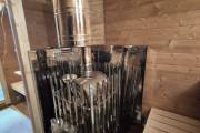 Баня сделана из отсортированной термодоски — мы отобрали хорошее дерево, но с небольшими косметическими изъянами. Ничего критичного, просто живой материал с характером.