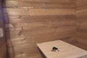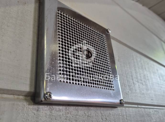 Баня сделана из отсортированной термодоски — мы отобрали хорошее дерево, но с небольшими косметическими изъянами. Ничего критичного, просто живой материал с характером.
