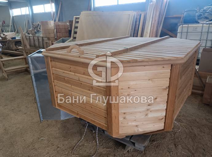 Снаружи купель обшита термомодифицированной вагонкой, которой не страшны сырость и палящее солнце. Материал по свойствам напоминает пластик.
