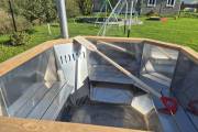 Большой надёжный чан для купания из нержавеющей стали восьмиугольной формы. Благодаря широким стенам и регулирующимся по высоте скамейкам обеспечивается особый комфорт при купании. Края сидений аккуратно закруглены во избежании неприятных ощущений.