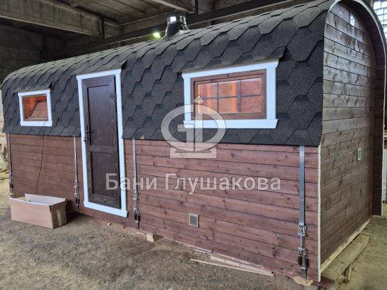 Конструкция на основе бочковой доски остаётся лёгкой, что упрощает монтаж и снижает требования к фундаменту — баню можно установить даже на сложных участках.