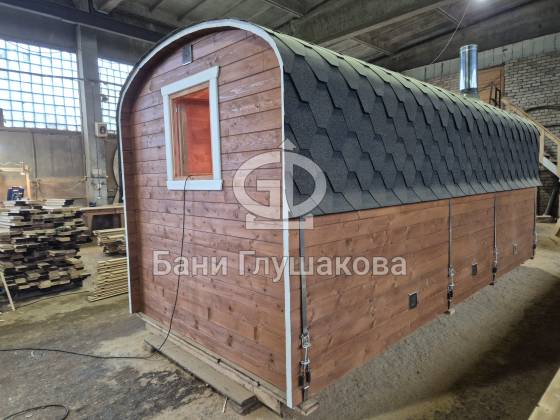 Баня выполнена из бочковой термодоски — материала, устойчивого к влаге, температурным перепадам и деформации. Такая конструкция остаётся лёгкой, но при этом тёплой и долговечной.