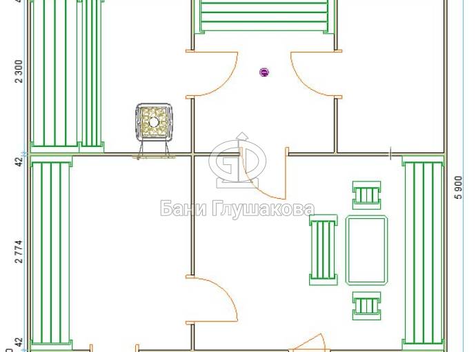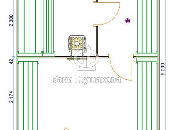 Предбанник размером 2,3 × 3 метра служит переходной зоной между улицей и комнатой отдыха: здесь можно снять обувь и верхнюю одежду, не занося влагу и грязь внутрь. Также это отличное место для хранения аксессуаров, дров и банных принадлежностей.
