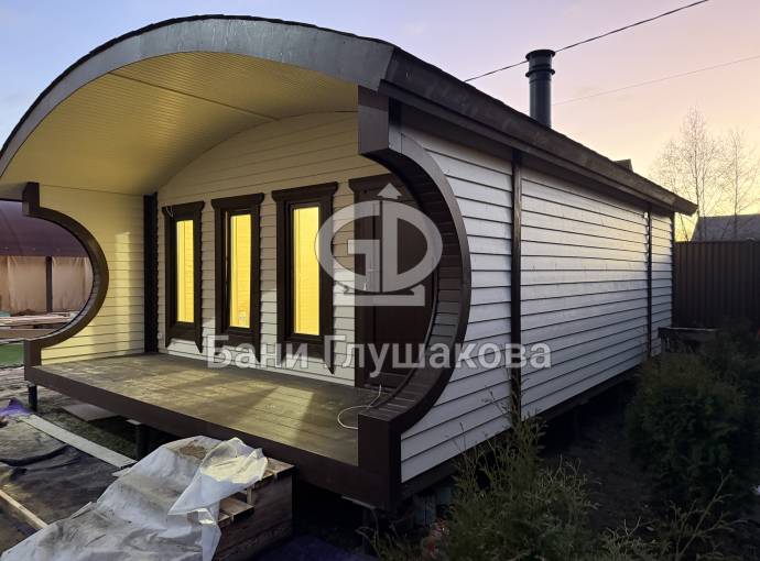 Такая терраса не только защищает входную зону от осадков, но и превращает баню в настоящий арт-объект на вашем участке. Если вам хочется уйти от стандартных прямоугольных форм и добавить архитектуре легкости, обязательно уточните возможность установки лунной террасы при расчете проекта у наших менеджеров.