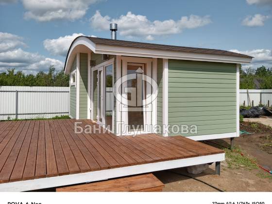 В лучших традициях Дмитрия Глушакова баня выполнена по каркасной технологии из доски внахлёст. Отличительная особенность — плавная округлая крыша, переходящая в удлинённую боковую стену. Перед бане расположена небольшая терраса.