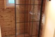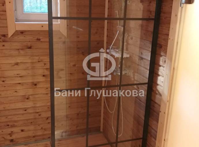 Из неё вы попадаете в помывочную, где по всей площади установлен герметичный пластиковый поддон — практичное и долговечное решение для влажных помещений.