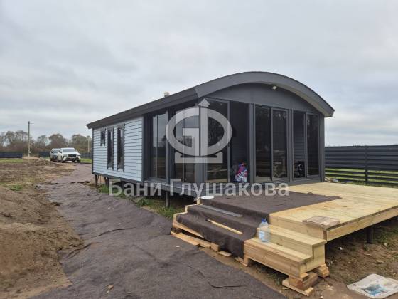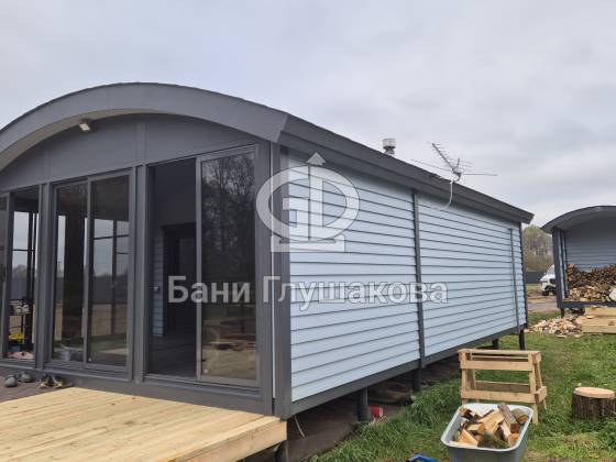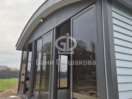 В лучших традициях Дмитрия Глушакова баня выполнена по каркасной технологии из доски внахлёст. Отличительная особенность — плавная округлая крыша, переходящая в удлинённую боковую стену. Перед бане расположена небольшая терраса.
