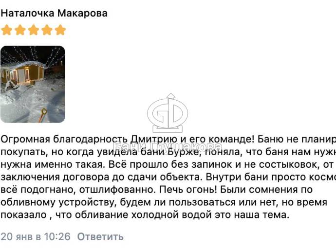 * Внимание! В характеристиках и опциях указана нестандартная комплектация бани. Вы можете заказать повтор или выбрать доп.опции для формирования собственной комплектации.