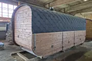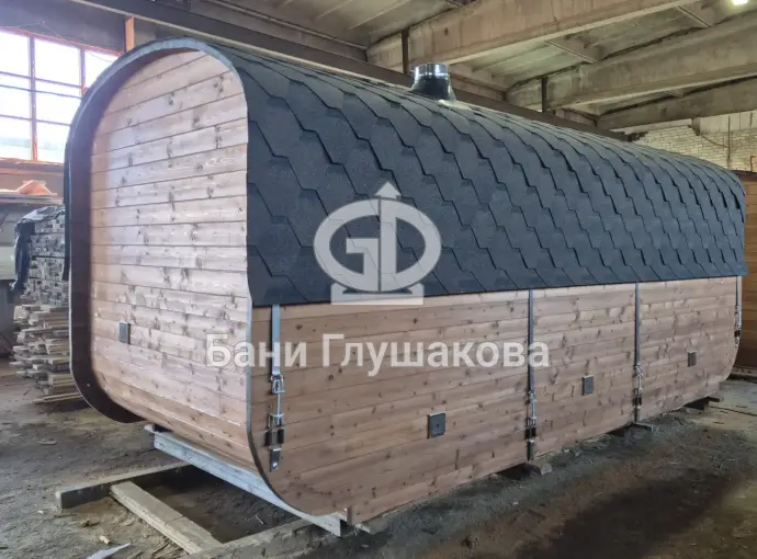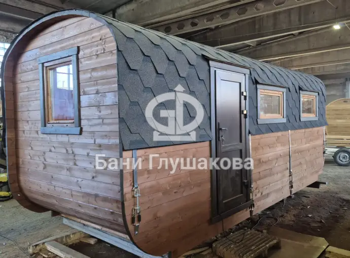Баня «Карета» – это продвинутая вариация бани бочки, которая изготавливается из бочковой доски. Как правило, большинство бань мы изготавливаем из термомодифицированной доски.