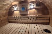 В стоимость уже входит сборка, печь нашего производства с двумя каменками и парогенератором, электрика, металлические уличные светильники, ступеньки. Вокруг печи стоит металлический экран. Установлены металлические комплектующие из нержавейки: вентиляционные клапаны-задвижки, крепления для проводки, наличник на форточку и порожек между помещениями. Ступеньки тоже уже входят в стоимость. Замечательная расстановка в парной: широкие полки поставлены углом, а печь сбоку. Поверьте нашему многолетнему опыту — это и правда самый удобный вариант.