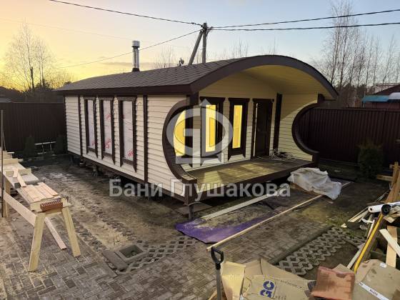 Изящные бани с фирменной округлой крышей и галереей высоких окон. Строим по каркасной технологии или из бруса на выбор.